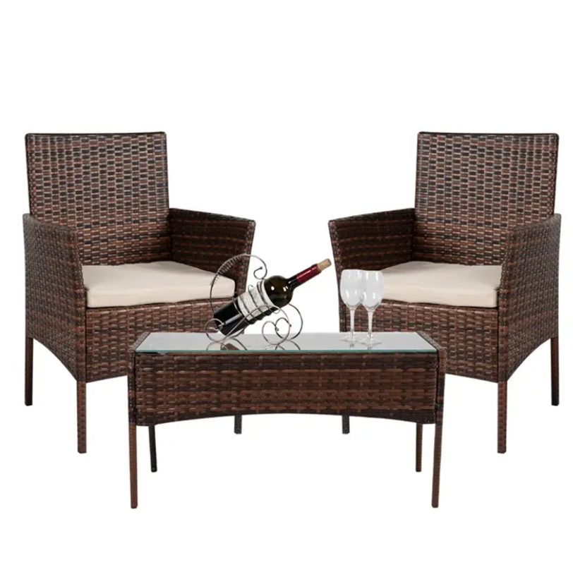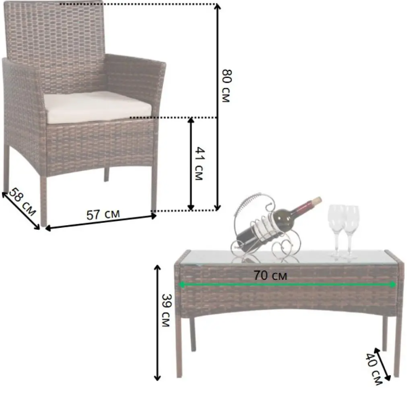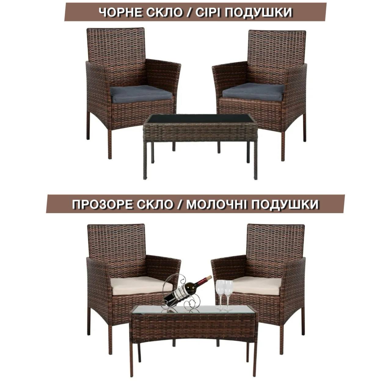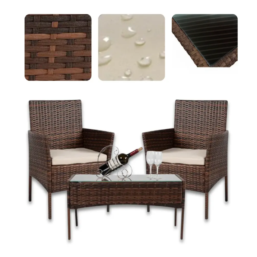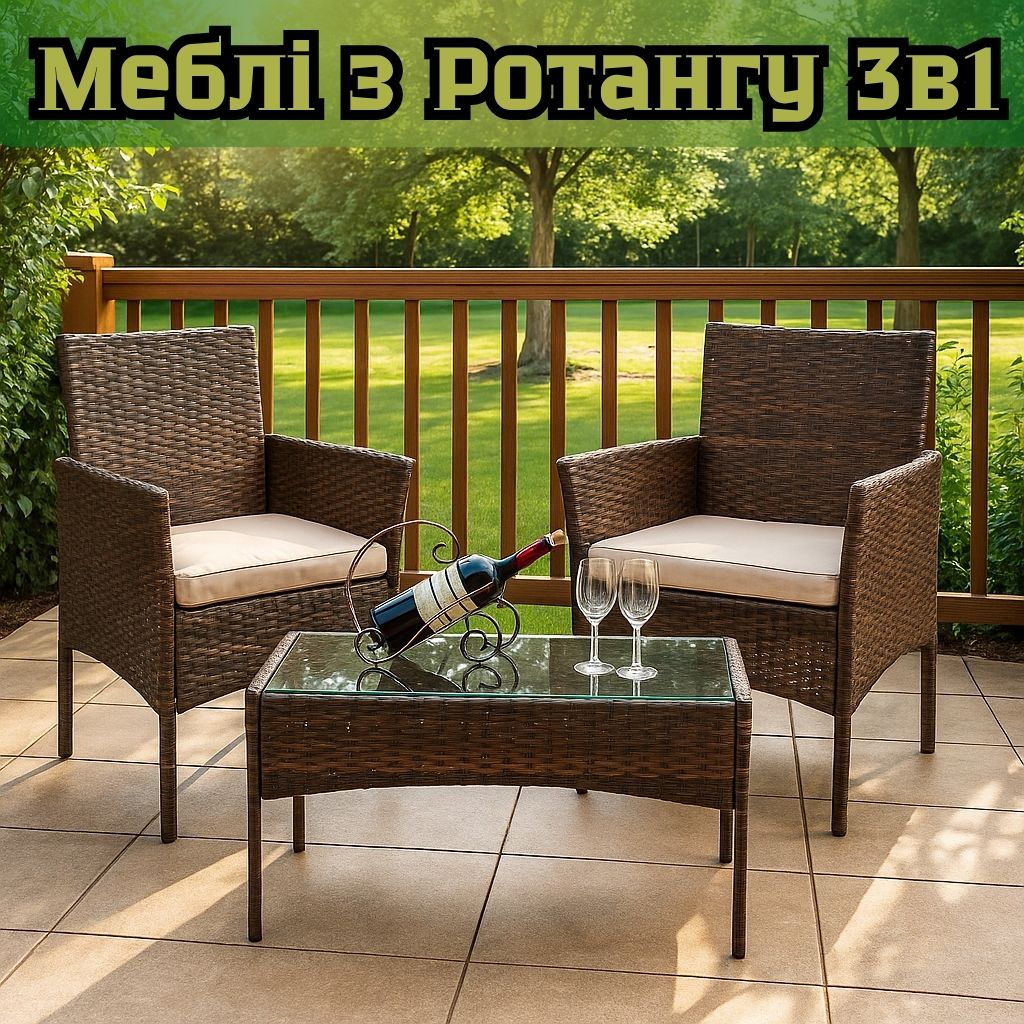 Меблі з ротангу 3в1 - це універсальне рішення для тераси, саду або балкона. Каркас виготовлений зі сталі з порошковим покриттям, що забезпечує довговічність. Плетіння зі штучного ротангу стійке до вологи, сонця та механічних пошкоджень.